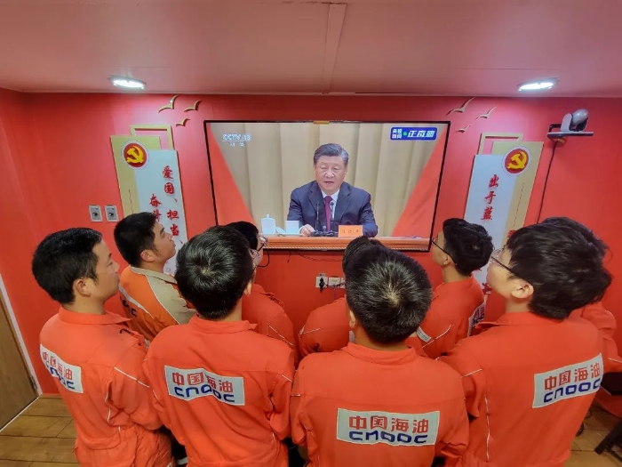 ▲ 第26屆中國(guó)青年五四獎(jiǎng)?wù)录w,中國(guó)海油“深海一號(hào)”開(kāi)發(fā)生產(chǎn)團(tuán)隊(duì)的青年在南海萬(wàn)億方大氣區(qū)建設(shè)現(xiàn)場(chǎng)聆聽(tīng)了習(xí)近平總書記在慶祝中國(guó)共產(chǎn)主義青年團(tuán)成立100周年大會(huì)上的重要講話。