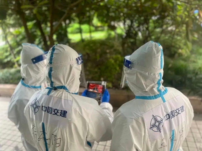 ▲ 中交上航局團(tuán)員青年在參與街道疫情防控休憩時(shí)間觀看直播。