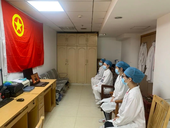 ▲ 中國(guó)五礦中冶醫(yī)院團(tuán)員青年收看慶祝共青團(tuán)成立100周年大會(huì)。