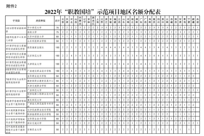 2.2022年“職教國培”示范項目地區(qū)名額分配表