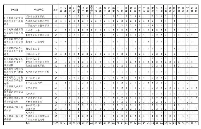 2022年“職教國培”示范項目共設(shè)置培訓(xùn)團(tuán)隊研修、教師培訓(xùn)、校長(書記)培訓(xùn)3大類8個項目24個子項目,經(jīng)單位申報、專家評審,研究確定承訓(xùn)單位43個(名單見附件1)。