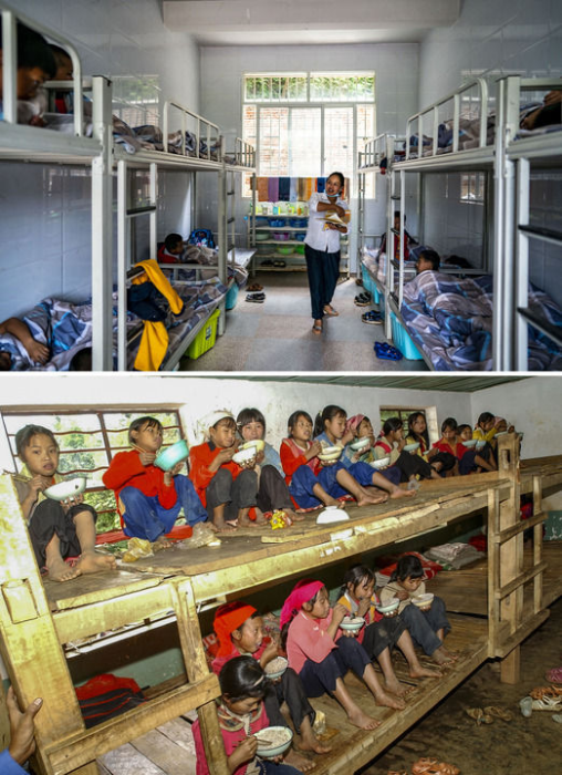 拼版照片:上圖為2021年9月8日,云南省瀾滄拉祜族自治縣木戛鄉(xiāng)哈卜嗎村小學(xué)的學(xué)生在宿舍休息(新華社記者 江文耀 攝);下圖為2003年,哈卜嗎村小學(xué)的學(xué)生在宿舍吃飯(新華社記者 秦 晴 攝)。新華社發(fā)