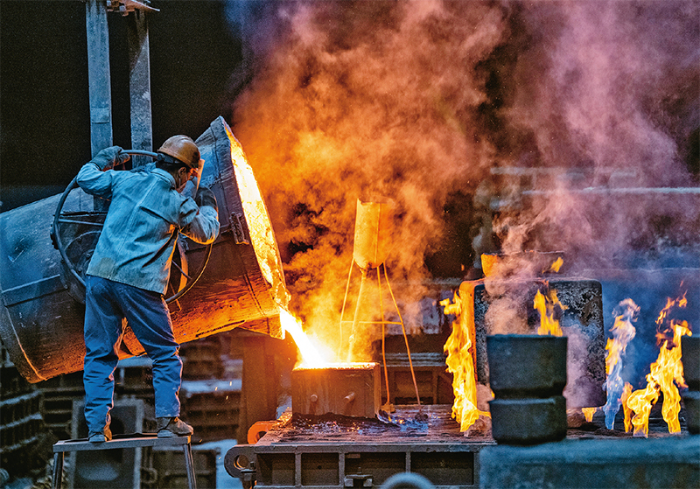 近年來,浙江諸暨姚江鎮(zhèn)積極助推機(jī)床鑄造業(yè)“煤轉(zhuǎn)電”項(xiàng)目,助力企業(yè)實(shí)現(xiàn)硫化物零排放,低碳環(huán)保,高效節(jié)能。圖為2021年4月15日,一名工人將澆鑄包內(nèi)的鐵水倒入鑄模內(nèi)。 求是圖片 郭斌/攝