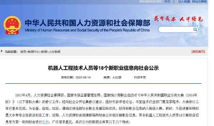 6月14日,人力資源和社會保障部官網(wǎng)發(fā)布《機器人工程技術(shù)人員等18個新職業(yè)信息向社會公示》,公示全文如下: