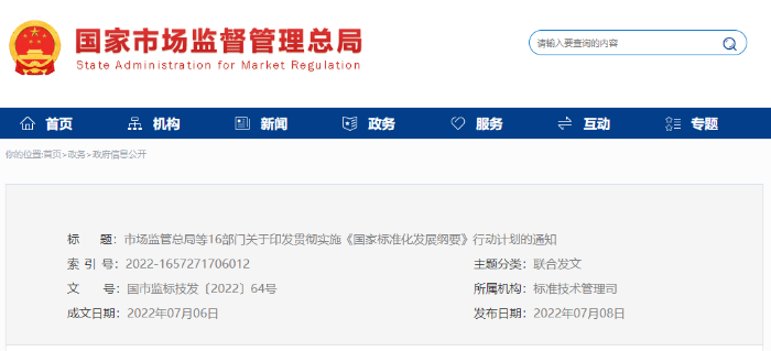 國家發(fā)展改革委、市場監(jiān)管總局、中央網(wǎng)信辦、科技部、工業(yè)和信息化部、公安部、民政部、住房城鄉(xiāng)建設(shè)部、交通運輸部、農(nóng)業(yè)農(nóng)村部、商務(wù)部、衛(wèi)生健康委、應(yīng)急部、人民銀行、國務(wù)院國資委、全國工商聯(lián)16部門聯(lián)合發(fā)布《貫徹實施〈國家標準化發(fā)展綱要〉行動計劃》。