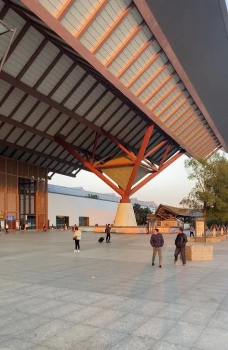 2020年12月經(jīng)過蘇州站時拍攝。設(shè)計時,支撐結(jié)構(gòu)“燈籠柱”和吊頂?shù)慕唤缣幃敃r也推敲了很多方案,最后形成了現(xiàn)在的效果。