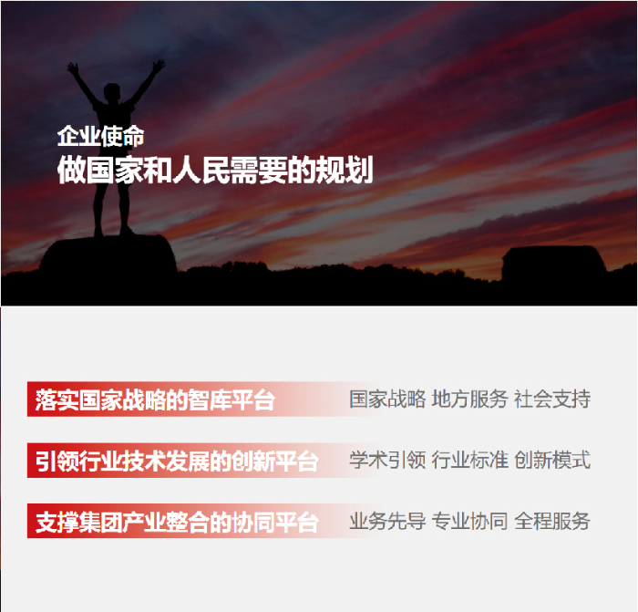 中城規(guī)劃以“做國家和人民需要的規(guī)劃”為企業(yè)使命,力求將公司打造成為落實(shí)國家戰(zhàn)略的智庫平臺(tái)、引領(lǐng)行業(yè)技術(shù)發(fā)展的創(chuàng)新平臺(tái)、支持集團(tuán)產(chǎn)業(yè)整合的協(xié)同平臺(tái)。