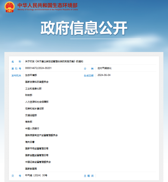 為深入貫徹落實(shí)《中共中央 國(guó)務(wù)院關(guān)于全面推進(jìn)美麗中國(guó)建設(shè)的意見(jiàn)》《中共中央 國(guó)務(wù)院關(guān)于完整準(zhǔn)確全面貫徹新發(fā)展理念做好碳達(dá)峰碳中和工作的意見(jiàn)》和《2030年前碳達(dá)峰行動(dòng)方案》部署要求,加快建立碳足跡管理體系,形成綠色低碳供應(yīng)鏈和生產(chǎn)生活方式,推動(dòng)新質(zhì)生產(chǎn)力發(fā)展,助力實(shí)現(xiàn)碳達(dá)峰碳中和目標(biāo),生態(tài)環(huán)境部會(huì)同國(guó)家發(fā)展改革委、工業(yè)和信息化部、財(cái)政部、人力資源社會(huì)保障部、住房城鄉(xiāng)建設(shè)部、交通運(yùn)輸部、商務(wù)部、中國(guó)人民銀行、國(guó)務(wù)院國(guó)資委、海關(guān)總署、市場(chǎng)監(jiān)管總局、金融監(jiān)管總局、中國(guó)證監(jiān)會(huì)、國(guó)家數(shù)據(jù)局制定了《關(guān)于建立碳足跡管理體系的實(shí)施方案》?,F(xiàn)印發(fā)給你們,請(qǐng)認(rèn)真抓好落實(shí)。